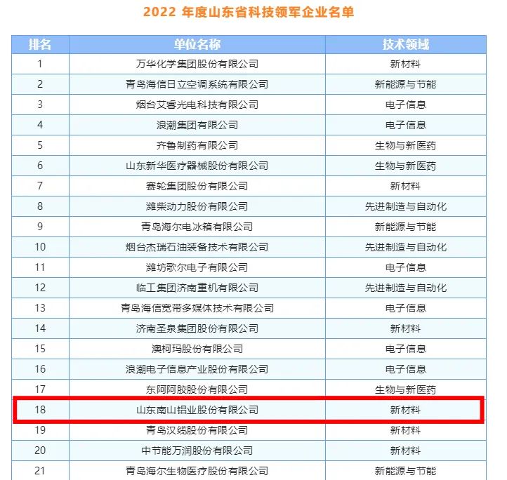 11月9日,在省科技廳指導下,山東省科學院情報研究所、山東省創(chuàng)新發(fā)展研究院在濟南聯(lián)合舉行2022年度山東省科技領(lǐng)軍企業(yè)和首批科技小巨人企業(yè)名單發(fā)布會,向社會發(fā)布了200家科技領(lǐng)軍企業(yè)名單和600家科技小巨人企業(yè)名單,山東南山鋁業(yè)股份有限公司等企業(yè)從全省高新技術(shù)企業(yè)群體中脫穎而出,入選科技領(lǐng)軍企業(yè)。