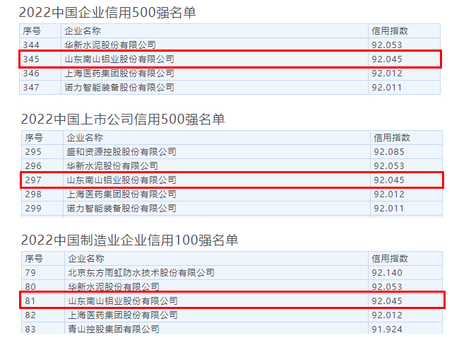 論壇上發(fā)布了《中國企業(yè)信用發(fā)展報告2022》,這是中國企業(yè)改革與發(fā)展研究會、中國合作貿(mào)易企業(yè)協(xié)會自2011年以來連續(xù)第12次向社會發(fā)布。發(fā)布了2022年度中國企業(yè)信用500強、中國制造業(yè)企業(yè)信用100強、中國服務(wù)業(yè)企業(yè)信用100強、中國民營企業(yè)信用100強、中國上市公司信用500強等系列榜單,南山鋁業(yè)憑借多年來良好的信用體系位列“2022中國企業(yè)信用500強”第345位、“2022中國上市公司信用500強”第297位、“2022中國制造業(yè)企業(yè)信用100強”第81位。