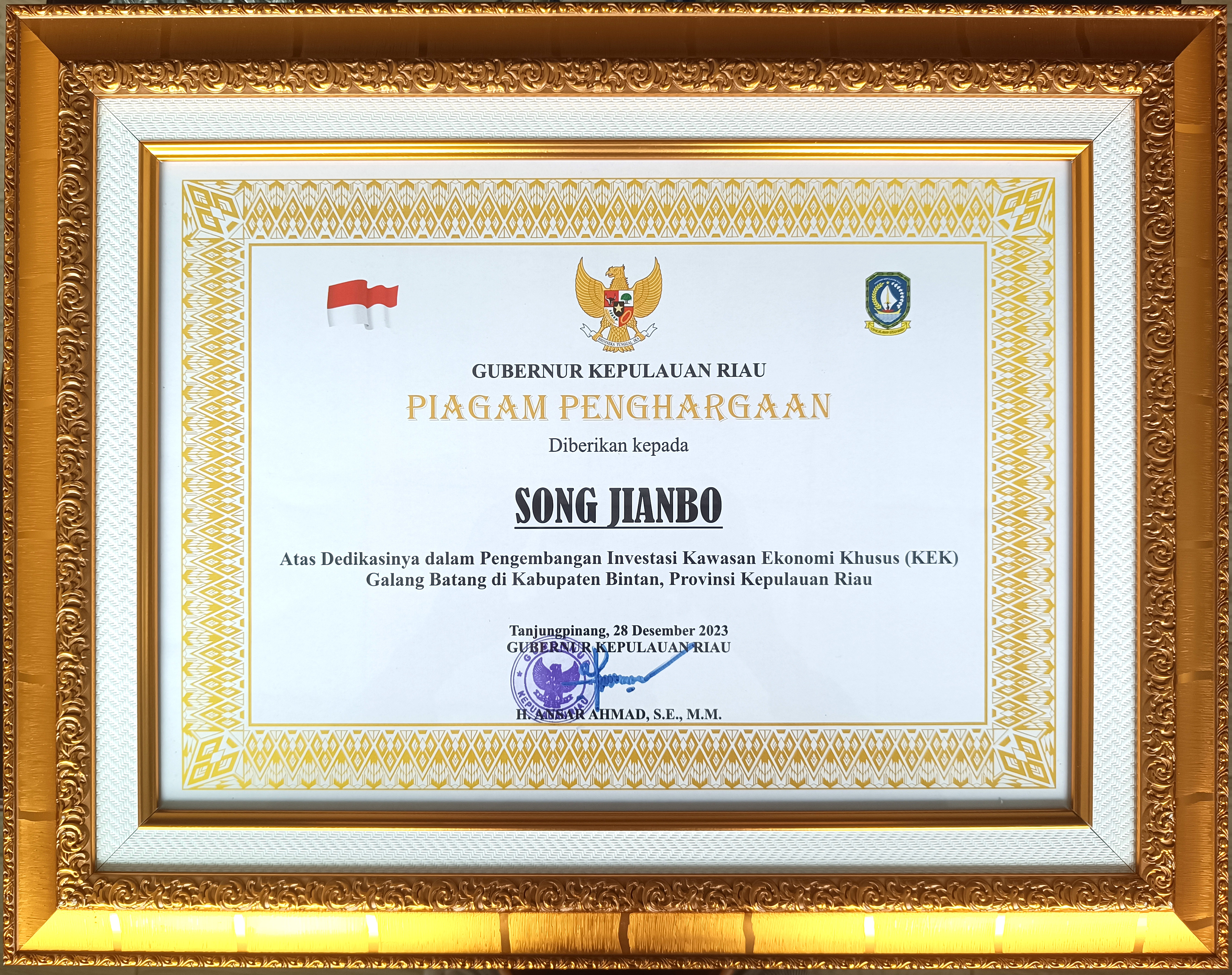 為表彰南山控股董事長(zhǎng)宋建波先生對(duì)印尼廖內(nèi)群島省建設(shè)發(fā)展做出的卓越貢獻(xiàn),2023年12月28日,廖內(nèi)群島省省長(zhǎng)安薩爾·艾哈邁德(Ansar Ahmad)在廖內(nèi)群島省政府為宋建波董事長(zhǎng)頒發(fā)了“廖內(nèi)群島省投資與發(fā)展卓越貢獻(xiàn)獎(jiǎng)”。