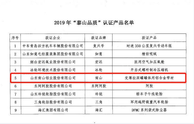 12月25日,“泰山品質(zhì)”認(rèn)證聯(lián)盟公布了《2019泰山品質(zhì)認(rèn)證名單》,山東南山鋁業(yè)股份有限公司生產(chǎn)的“變薄拉深罐罐體用鋁合金帶材”產(chǎn)品榜上有名。
