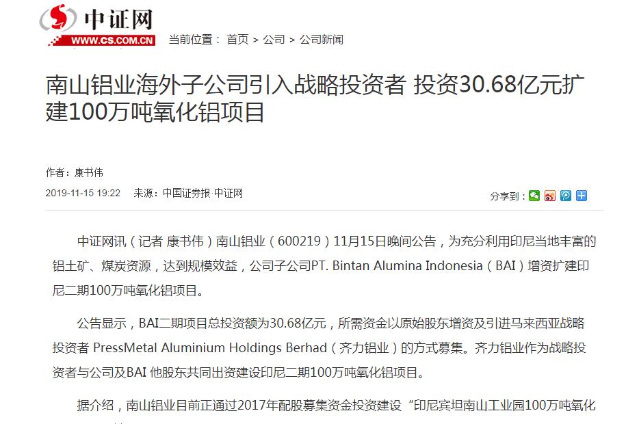南山鋁業(yè)海外子公司引入戰(zhàn)略投資者 投資30.68億元擴建100萬噸氧化鋁項目-中國證券報·中證網(wǎng)