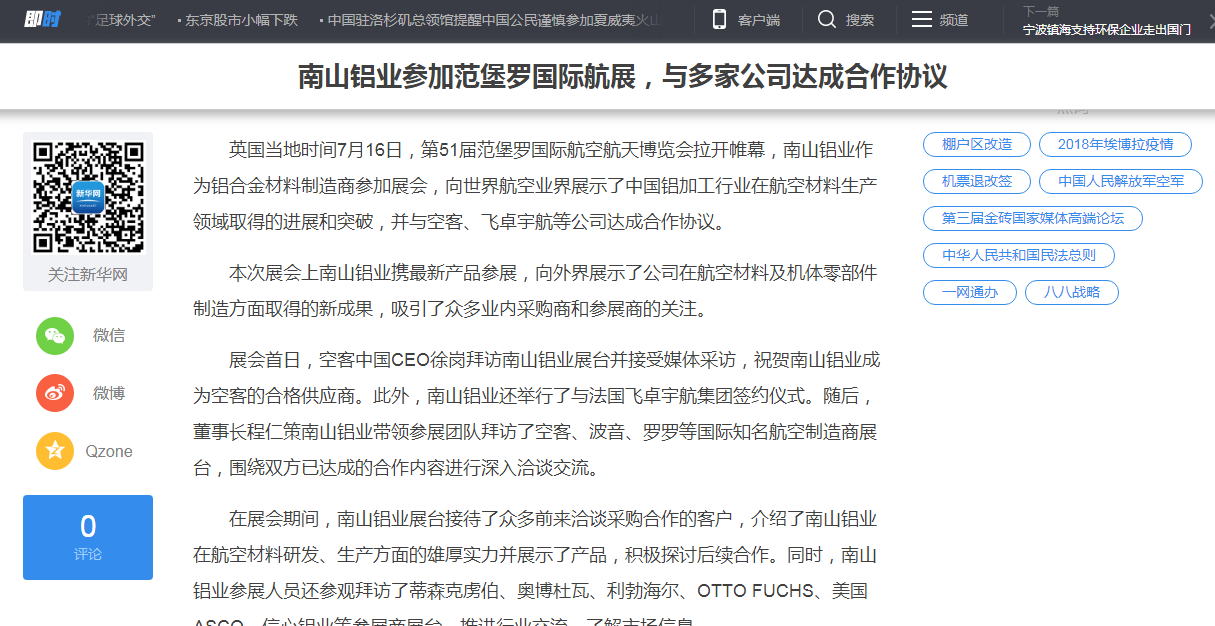 上證報(bào)訊 日前,備受矚目的全球最大鋁行業(yè)盛會(huì)——第12屆國際鋁工業(yè)展覽會(huì)暨鋁業(yè)大會(huì)(2018德國)在德國杜塞爾多夫盛大開幕,以高端制造為主題,突出“一站式解決方案”的產(chǎn)業(yè)鏈優(yōu)勢(shì)兼顧綠色環(huán)保的理念的南山鋁業(yè)在展會(huì)上受到眾多專業(yè)觀展者的高度關(guān)注。公司展示了近年來在汽車輕量化、航空航天等高端產(chǎn)品制造方面取得的最新成果。展會(huì)期間,南山鋁業(yè)董事長程仁策帶領(lǐng)高管團(tuán)隊(duì)與寶馬、奔馳、皇冠、百威等國際一流企業(yè)就汽車板認(rèn)證、罐料年度合同等事宜進(jìn)行了富有成效的交流,取得了豐碩成果。