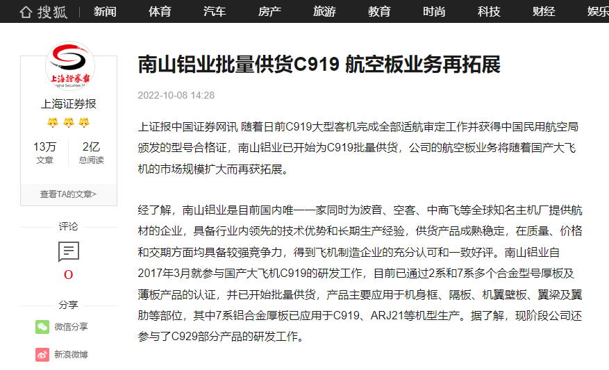 上海證券報(bào):南山鋁業(yè)批量供貨C919 航空板業(yè)務(wù)再拓展